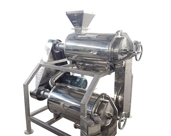 全自動番茄打漿機:電動機通過皮帶傳動,使安裝在花鍵上的刮板高速旋轉,當經過破碎的水果通過進料口進入機內時,接漿盤就把物料均勻排發到刮板和篩網處。由于刮板的回轉作用和導程角的存在,使物料沿著圓筒向出口端移動,移動的軌跡呈螺旋狀,物料就在刮板和篩筒之間移動過程中受離心力的作用而被擦碎,汁液和肉質(已成漿狀)從篩孔中通過送入下道工序,(雙道打漿機為聯動重復上列過程)皮和籽等則從出渣斗排出,以達到自動分離的目的。只要變換不同規格的篩網以及調整刮板導程角的大小,可改變不同的打漿速度,獲得滿意的效果。
