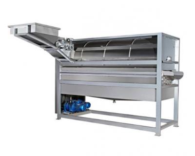 具有先進(jìn)水平的橙橘磨油機械,有結(jié)構(gòu)新穎緊湊、節(jié)能、生產(chǎn)能力大等優(yōu)點。作業(yè)原理:當(dāng)橙橘進(jìn)入進(jìn)料斗后,在均果翻爪的效果下均勻地進(jìn)入磨油倉內(nèi),并在數(shù)根帶刺磨油棍的效果下翻滾并沖突橙橘外表的油胞,一起在帶刺的空心螺旋效果下,輸向出料口端;而且該機在空心螺旋的斜上方設(shè)有噴淋管,從噴淋管噴出的水沖走橙橘上的油后,既能夠減小橙橘與橙橘之間粘度,便利橙橘翻滾,又能夠?qū)⒂晚槙车亓魅爰投穬?nèi)。為避免噴淋孔阻塞,在噴淋管內(nèi)裝有不銹鋼鋼絲刷,及時疏通噴淋孔。