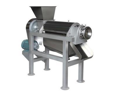 工作原理是破碎后的果肉、汁、皮通過進料斗進入螺旋榨汁機,由于螺旋沿著料渣出口方向底徑逐漸加大而螺距逐漸減少,當物料被螺旋推進時,因螺旋腔體積縮小,形成對物料的壓榨。螺旋主軸的轉動方向從進料斗向渣槽方向看去,為順時針方向。原料加入進料斗中,在螺旋的推進下受壓,其壓榨的汁液通過過濾網流入底部的盛汁器,而廢料則通過螺旋及調壓的錐形部分之間形成的環狀空隙排出,調壓頭沿軸向的移動可調整空隙的大小。用于順時針(從設備的出渣槽向進料斗端看轉動手輪軸承座時,調壓頭向左,空隙即縮小、反之則空隙變大。)改變空隙的大小,即調整排渣的阻力,即可改變出渣率,但如果空隙過小,在強力擠壓下,部分渣的顆粒會和汁一起通過過濾網被擠出,盡管出汁增加,但汁的質量相對下降,空隙的大小應視用戶具體工藝要求而定。從而達到汁與渣自動分離的目的。