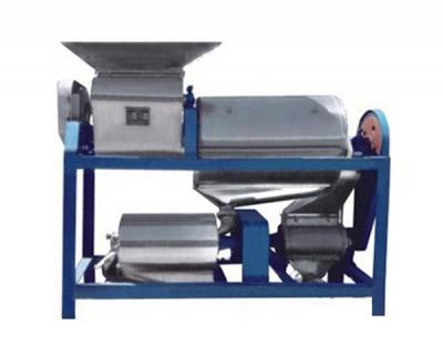 石榴榨汁機(jī)結(jié)構(gòu):該機(jī)主要由料斗、上粉碎裝置、下破碎裝置、旋轉(zhuǎn)篩、攪拌軸、螺桿泵、機(jī)架等組成。除傳動(dòng)部分外,本機(jī)采用全不銹鋼制造。攪拌軸采用變頻調(diào)速。工作原理:石榴從料斗進(jìn)入上粉碎裝置,上部破碎裝置按下石榴開(kāi),兩輥之間的間隙為20 mm,然后進(jìn)入下粉碎裝置。下部粉碎裝置再次擠壓石榴,兩輥之間的間隙為10 mm,兩階段擠壓后的石榴籽基本與皮籽分離,并落入分離裝置。在攪拌軸的攪拌下,石榴種子從篩孔脫落,石榴皮從尾部排出,上下壓輥為彈性結(jié)構(gòu)。間隙是可調(diào)的。